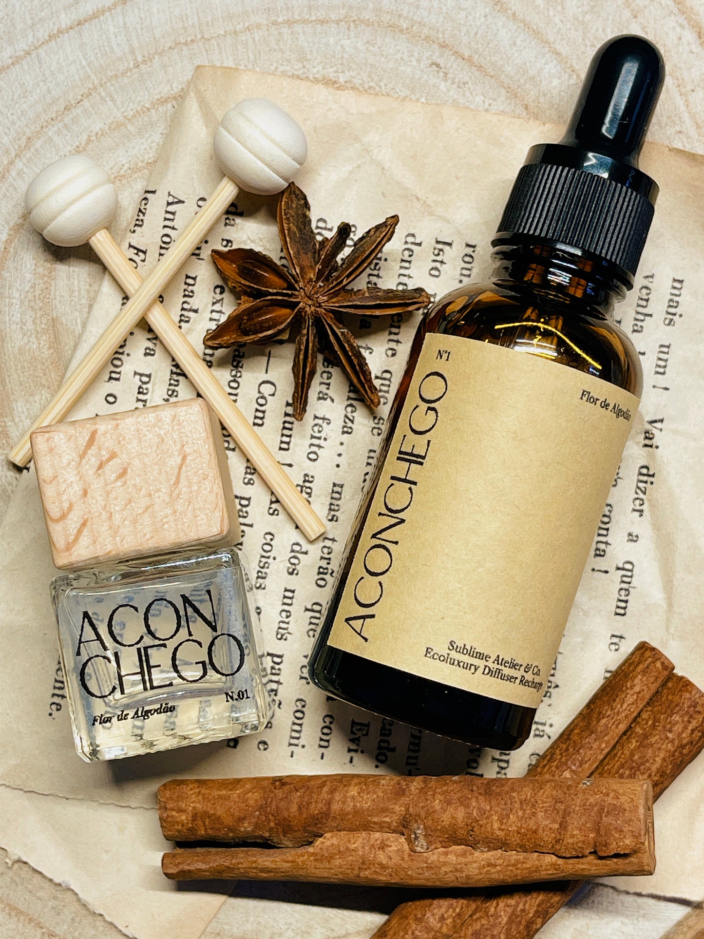 Coffret Aromático para Carro – Difusor de Varetas, Refil e Perfume de Ambiente | n°01 Aconchego - Flor de Algodão