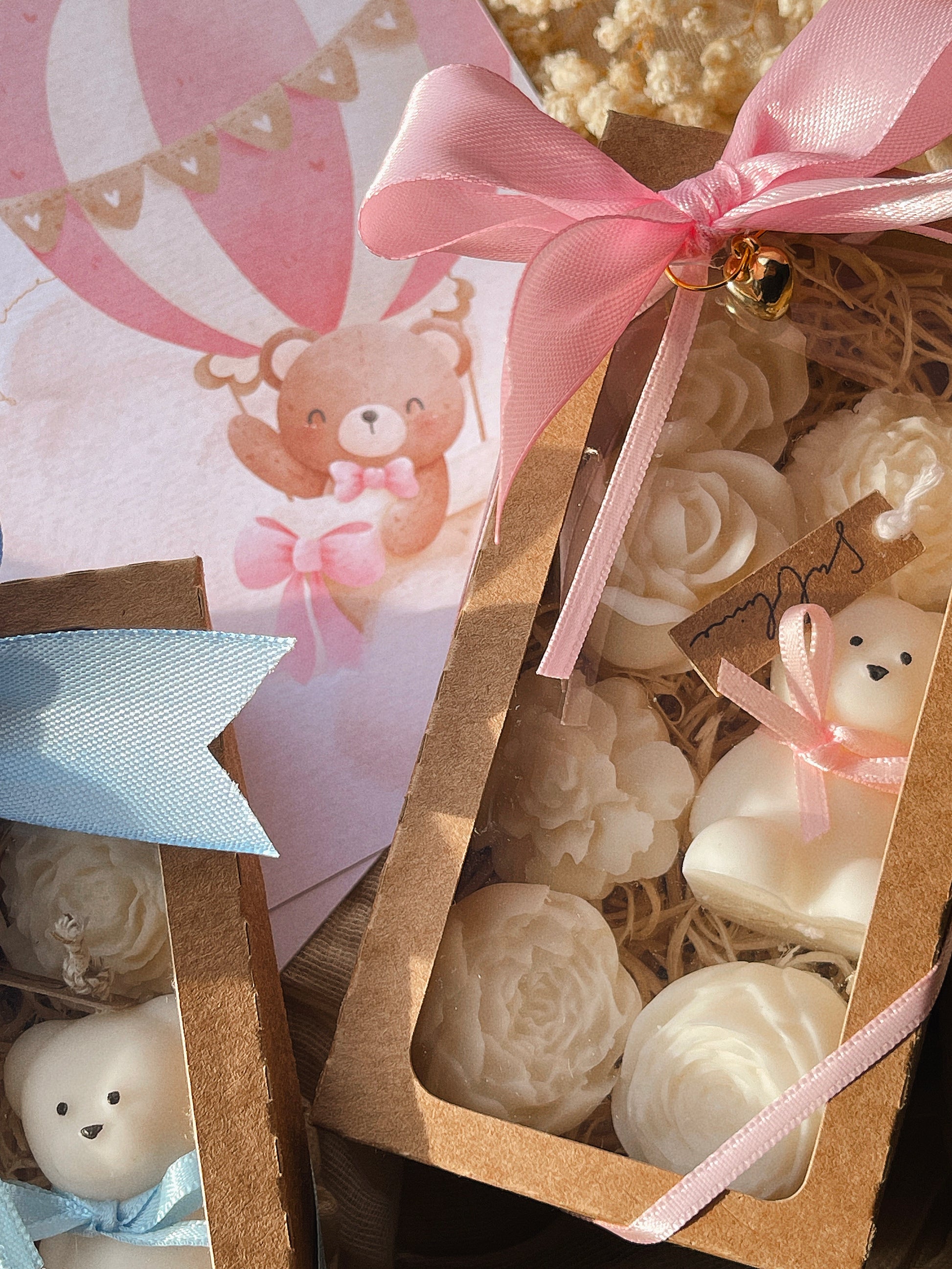 A delicadeza da vela decorativa em formato de ursinho se une à suavidade do wax melt em forma de flor, formando um mimo encantador que simboliza amor, proteção e aconchego.